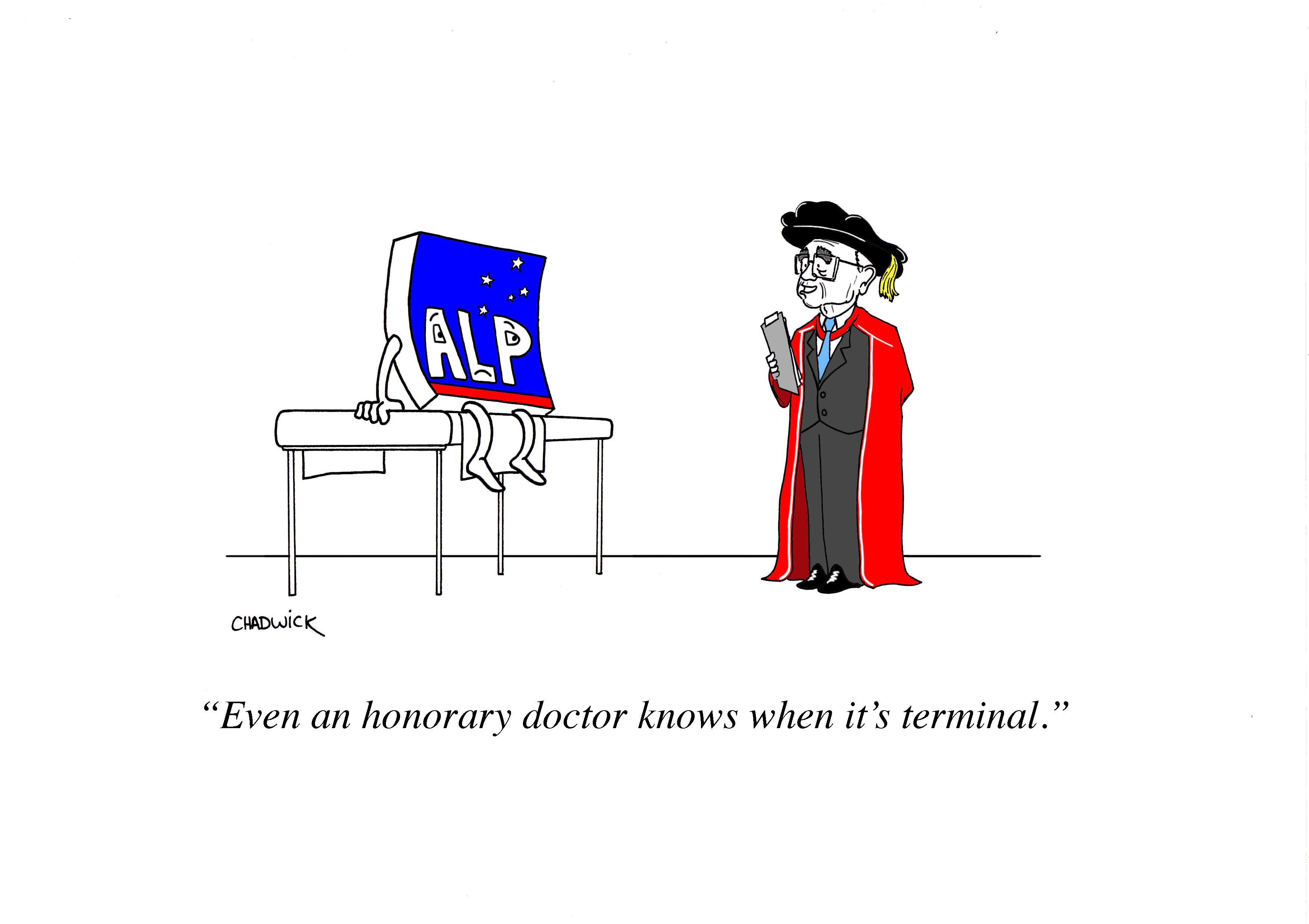 John Howard has received an honorary doctorate from Macquarie University thus allowing qualified use of the title ‘Dr’. This got me thinking about what a ‘Dr. Howard’ would treat if he were unleashed on patients – be they in human or political party form. Hope you enjoy the resulting cartoon 🙂