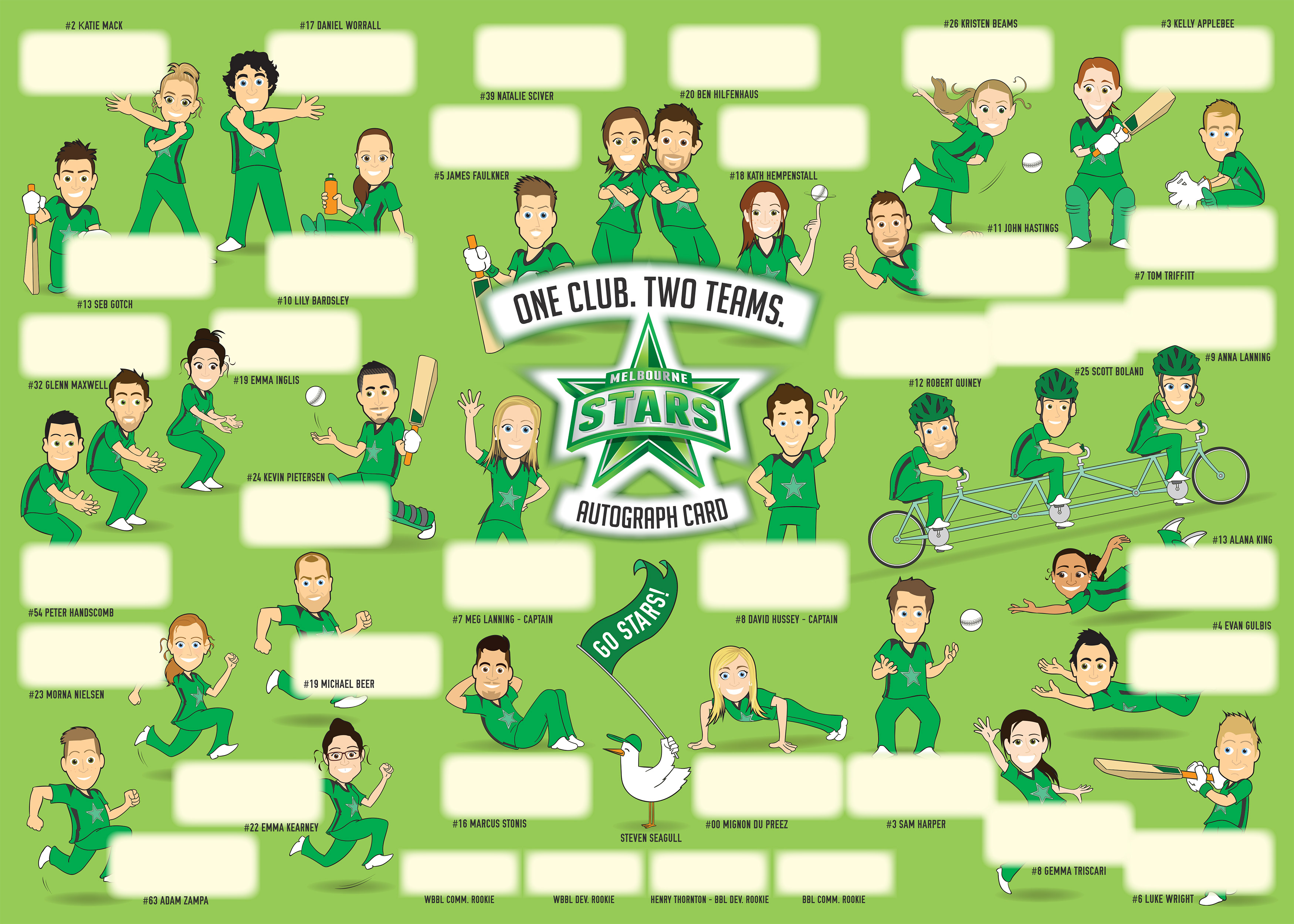 A3 size autograph card for the 2015-16 Melbourne Stars T20 Big Bash team. Includes all male and female players (plus Steven Seagull).